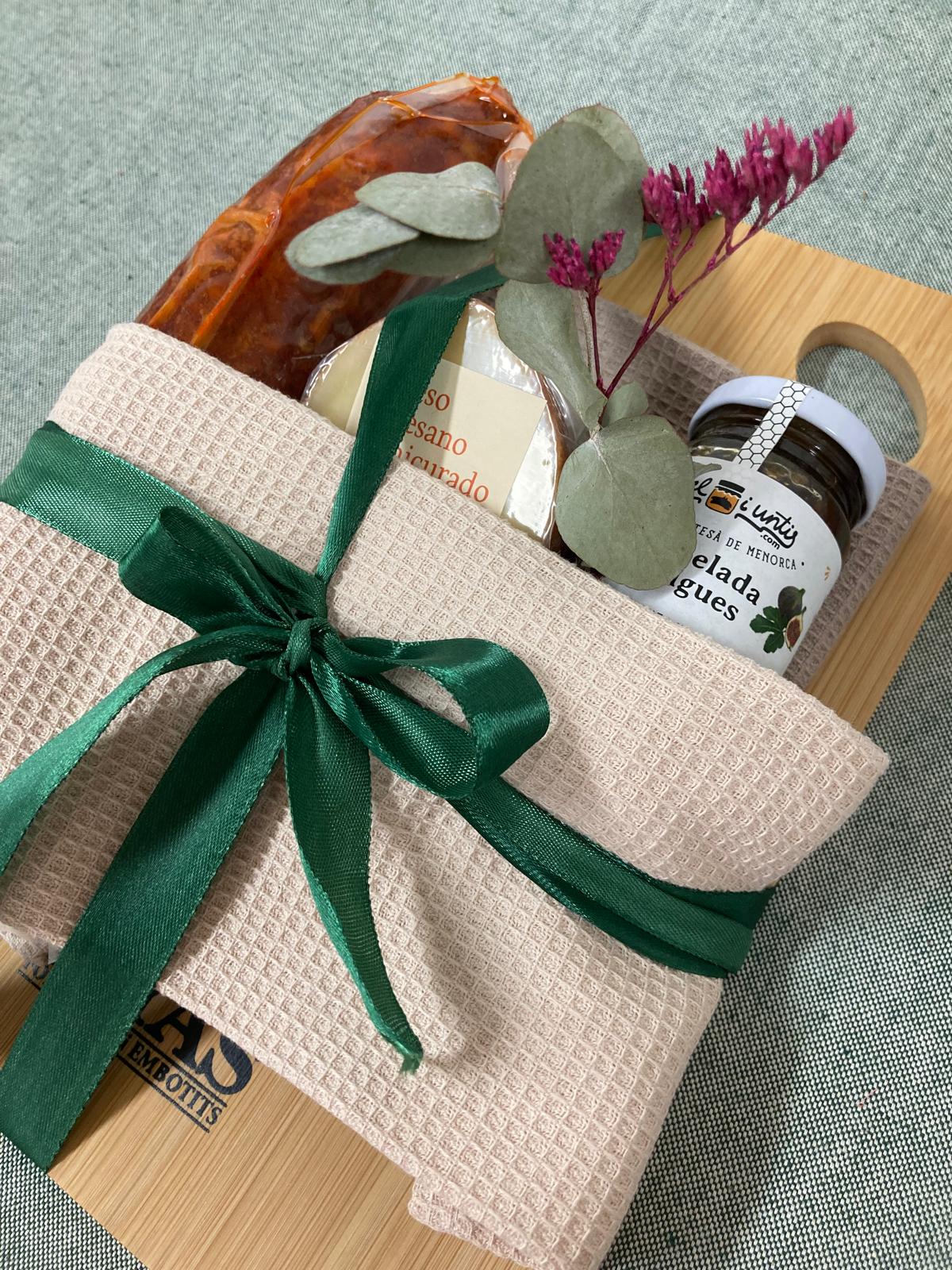 Sorprende con este delicioso lote de productos de Menorca: una tabla de cortar de Ca Na Fayas acompañada de dos trapos de cocina, una sobrasada curado, un octavo de queso artesano semicurado y una exquisita mermelada de higos. El detalle perfecto para amantes de la buena mesa.
